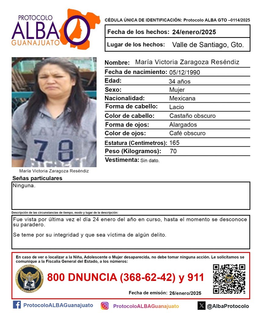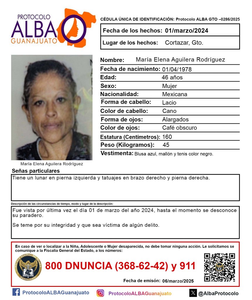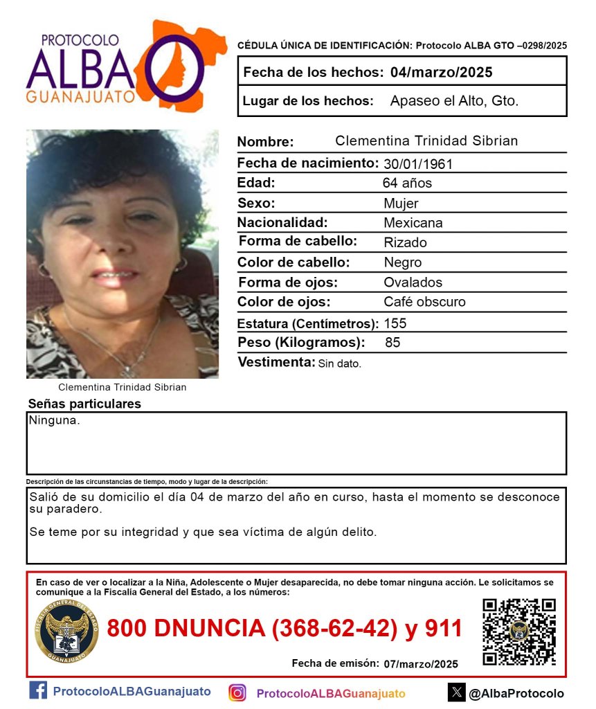 Clementina Trinidad Sibrian, de 64 años de edad, es una de las mujeres desaparecida en la entidad en fechas más recientes. Su ficha de búsqueda con el Protocolo Alba, fue publicada el día de ayer siete de marzo, no obstante fue vista por última vez el cuatro de marzo del presente.