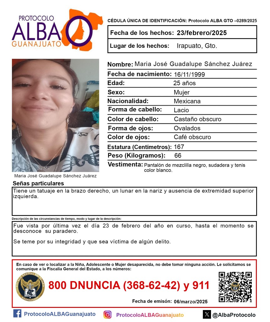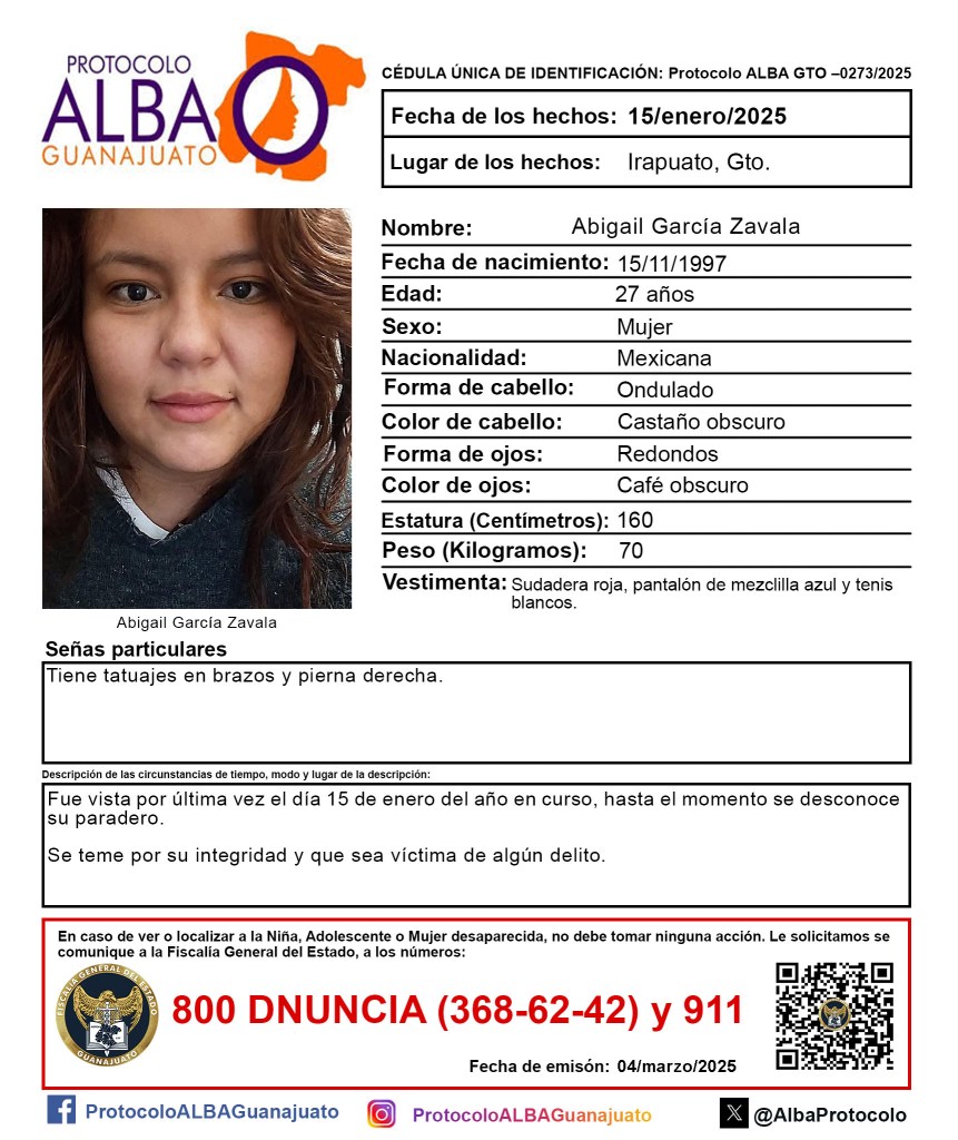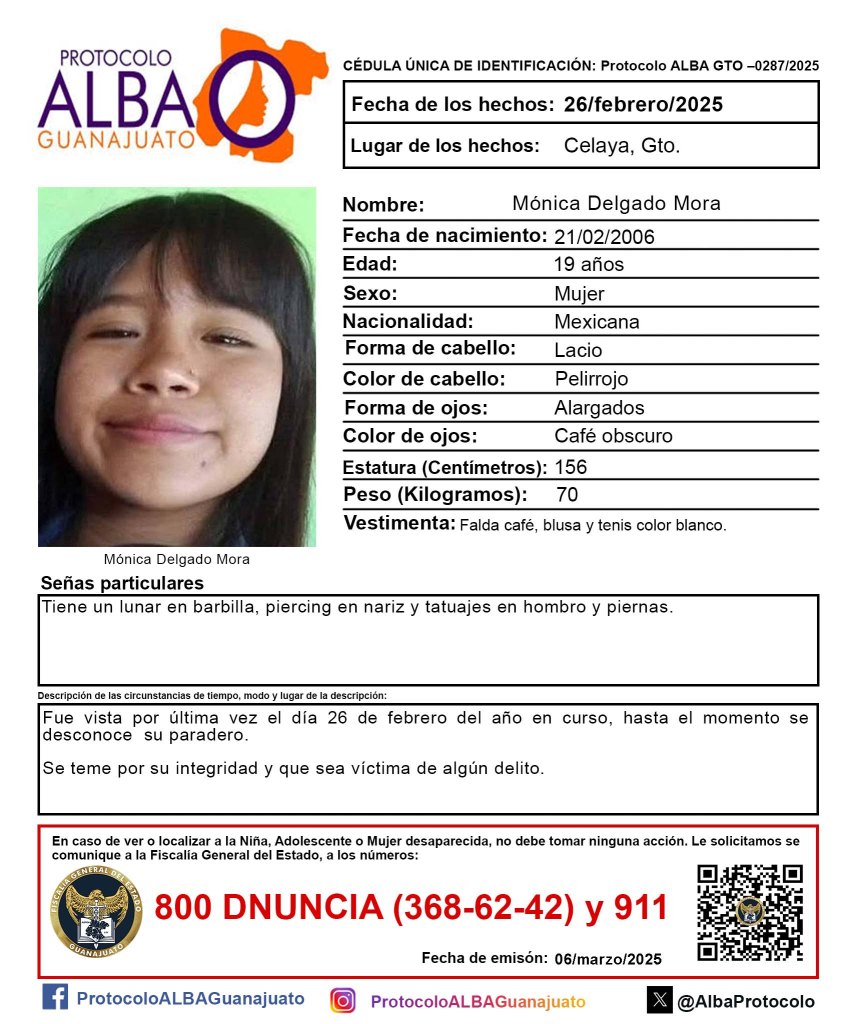 Otros nombres de mujeres desaparecidas en Guanajuato que resonarán este día y hasta que regresen a sus hogares con vida son: Mónica Delgado Mora, de 19 años; María Elena Aguilera Rodríguez, de 46 años; Abigail García Zavala, de 27 años; María Victoria Zaragoza Resendiz, de 34 años; Adriana Zaragoza Resendiz, de 35 años; y todas las mujeres que nos hacen falta en el estado.