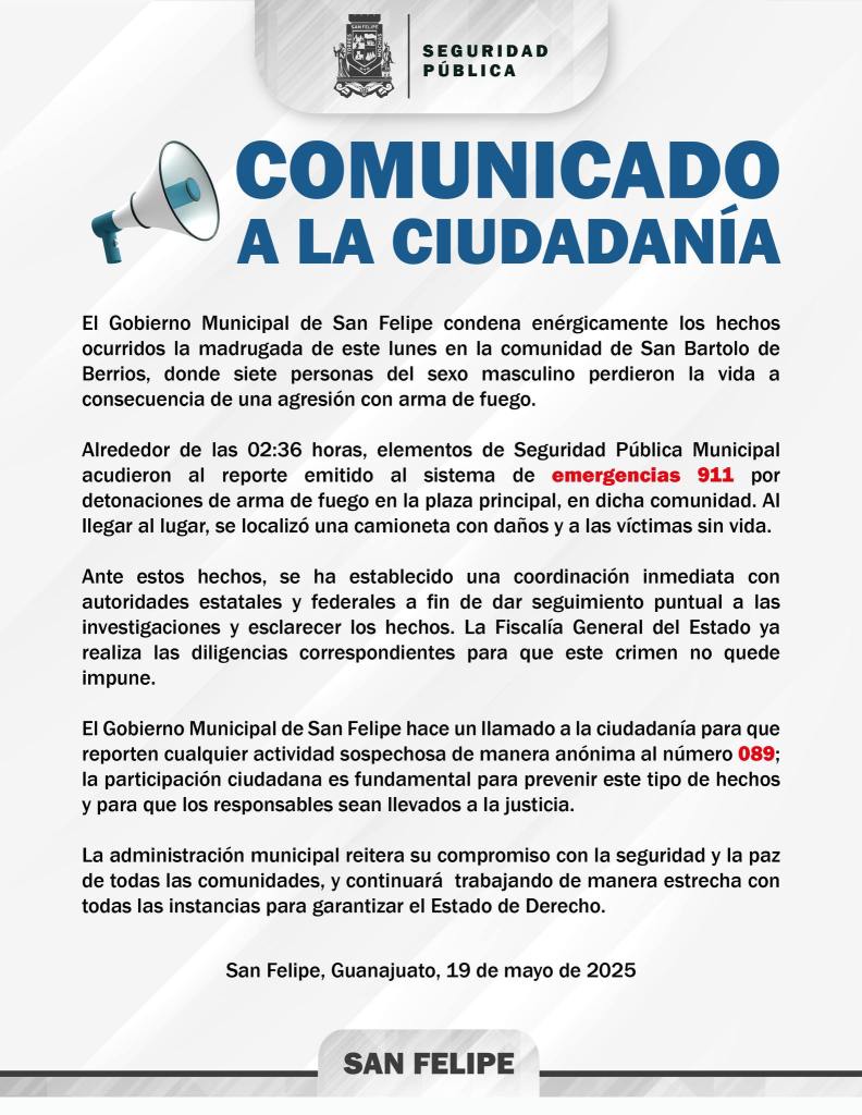Durante la madrugada del domingo 19 de mayo, siete jóvenes guanajuatenses perdieron la vida tras un ataque con armas de fuego de alto calibre. Los hechos se dieron en la comunidad de San Bartolo, del municipio de San Felipe alrededor de las 2:30 a.m. Autoridades estatales no se han pronunciado al respecto a más de 30 hrs del suceso.